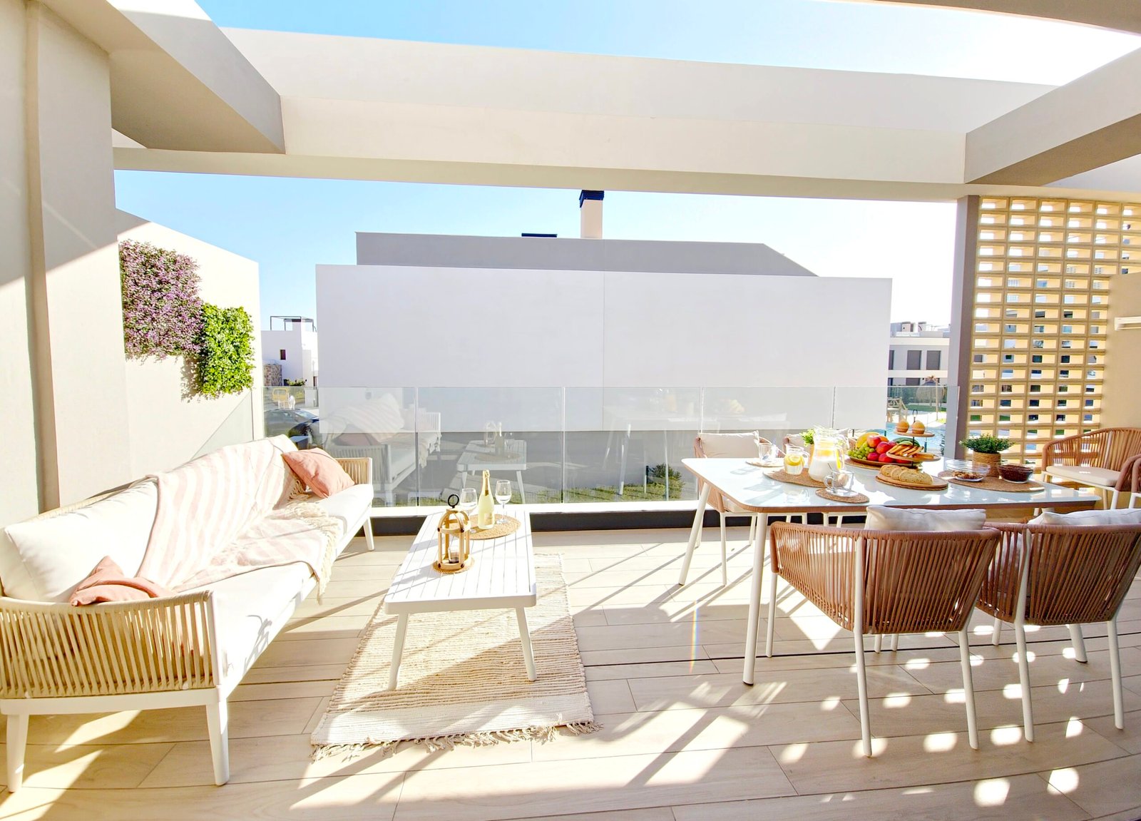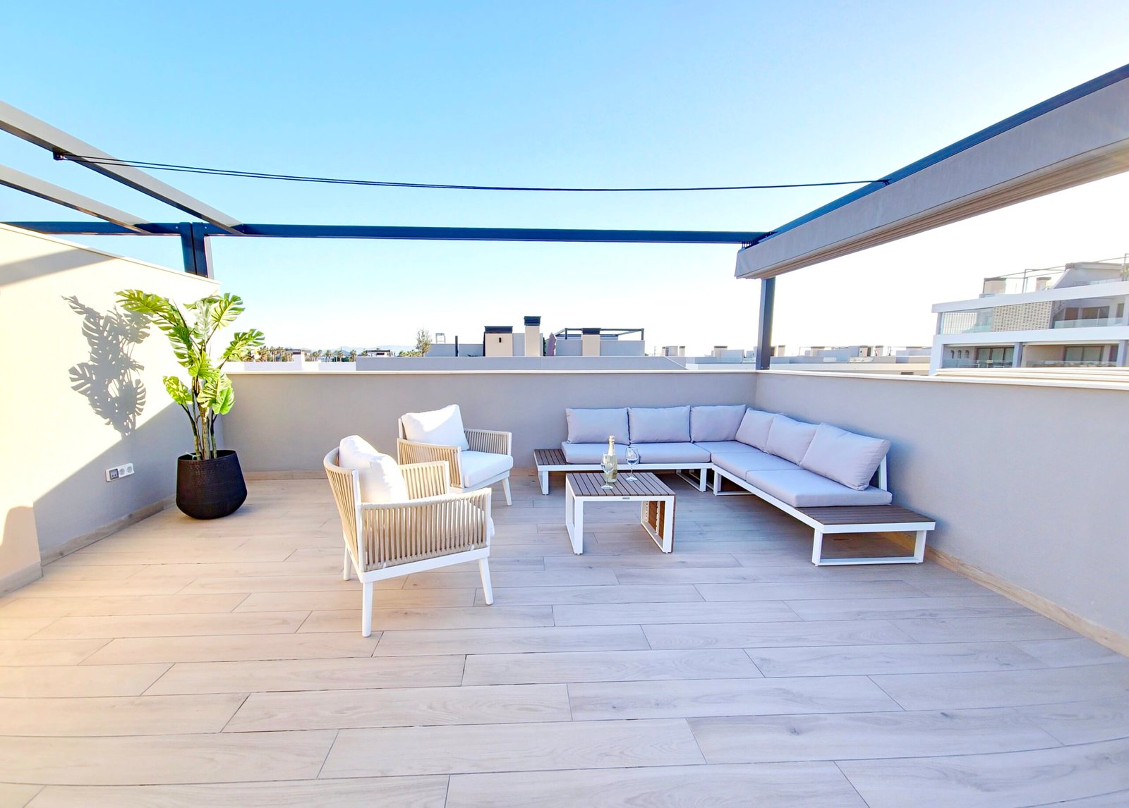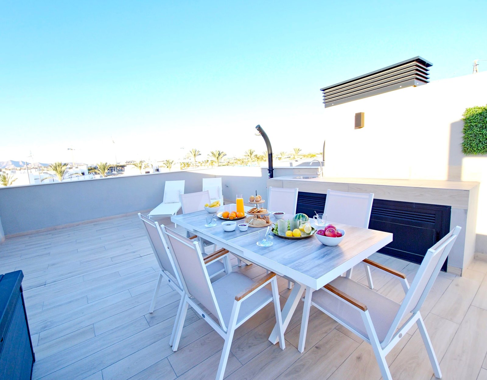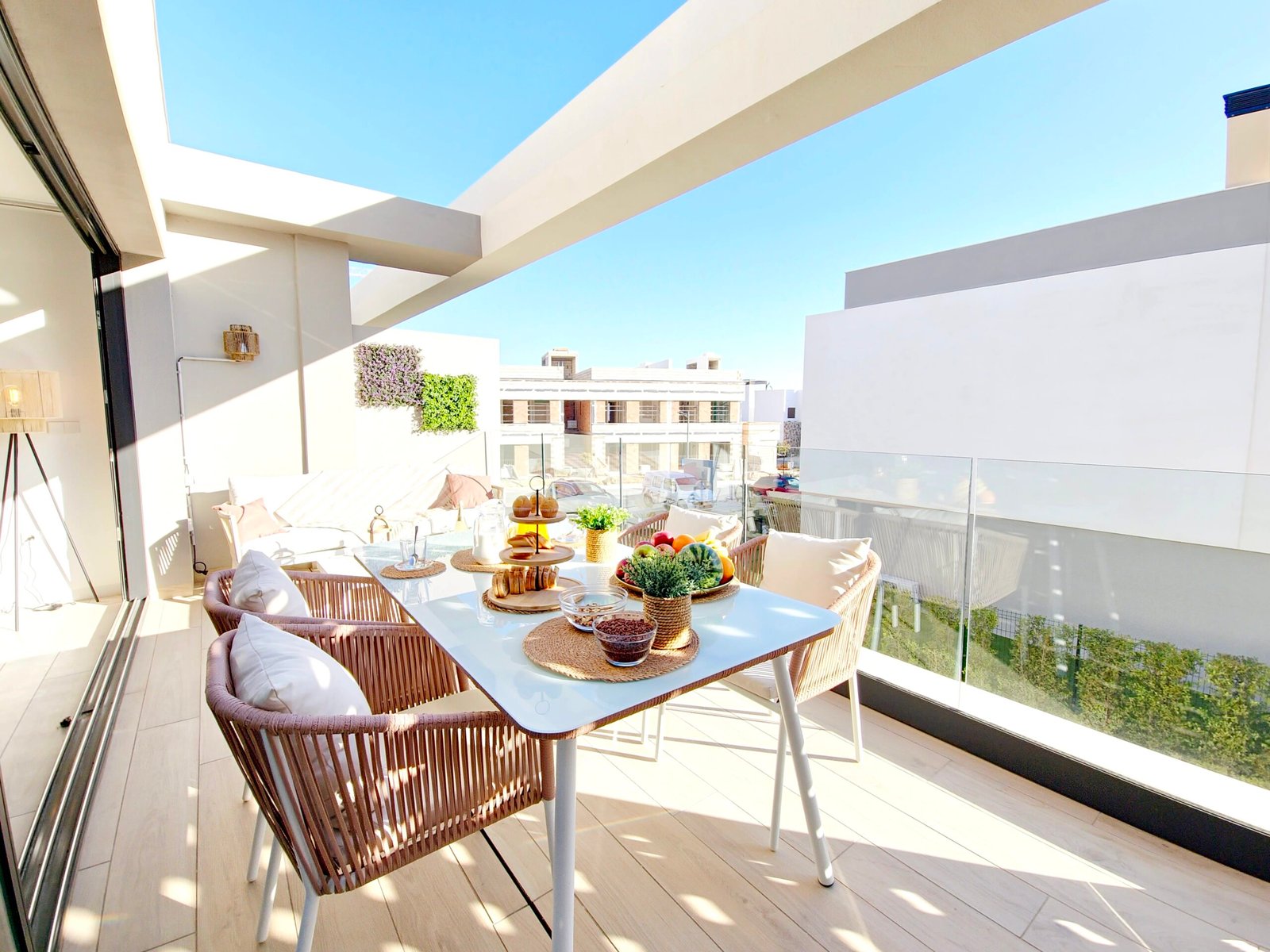Huoneistoon kuuluu oma parveke sekä laaja yksityinen kattoterassi (solarium), josta avautuvat kauniit näkymät viheralueille ja resortin uima-altaalle – täydellinen paikka auringosta nauttimiseen ja rentoutumiseen.