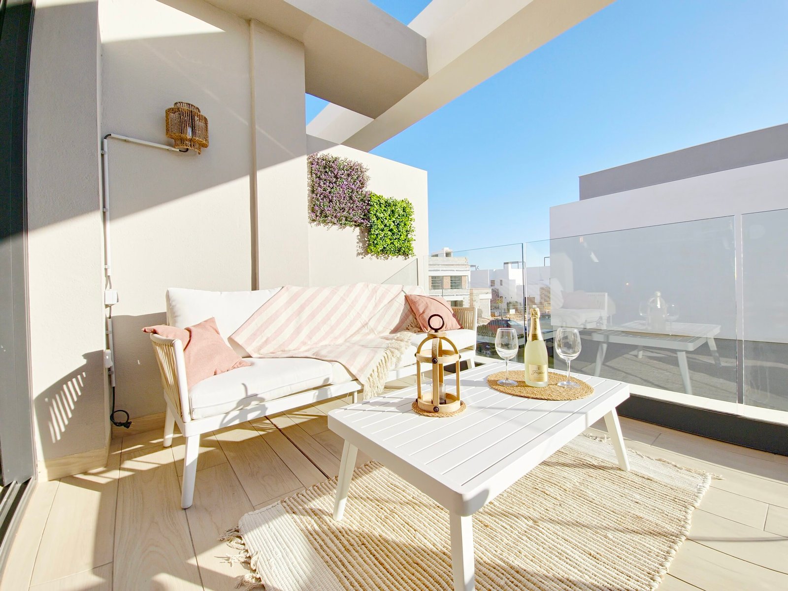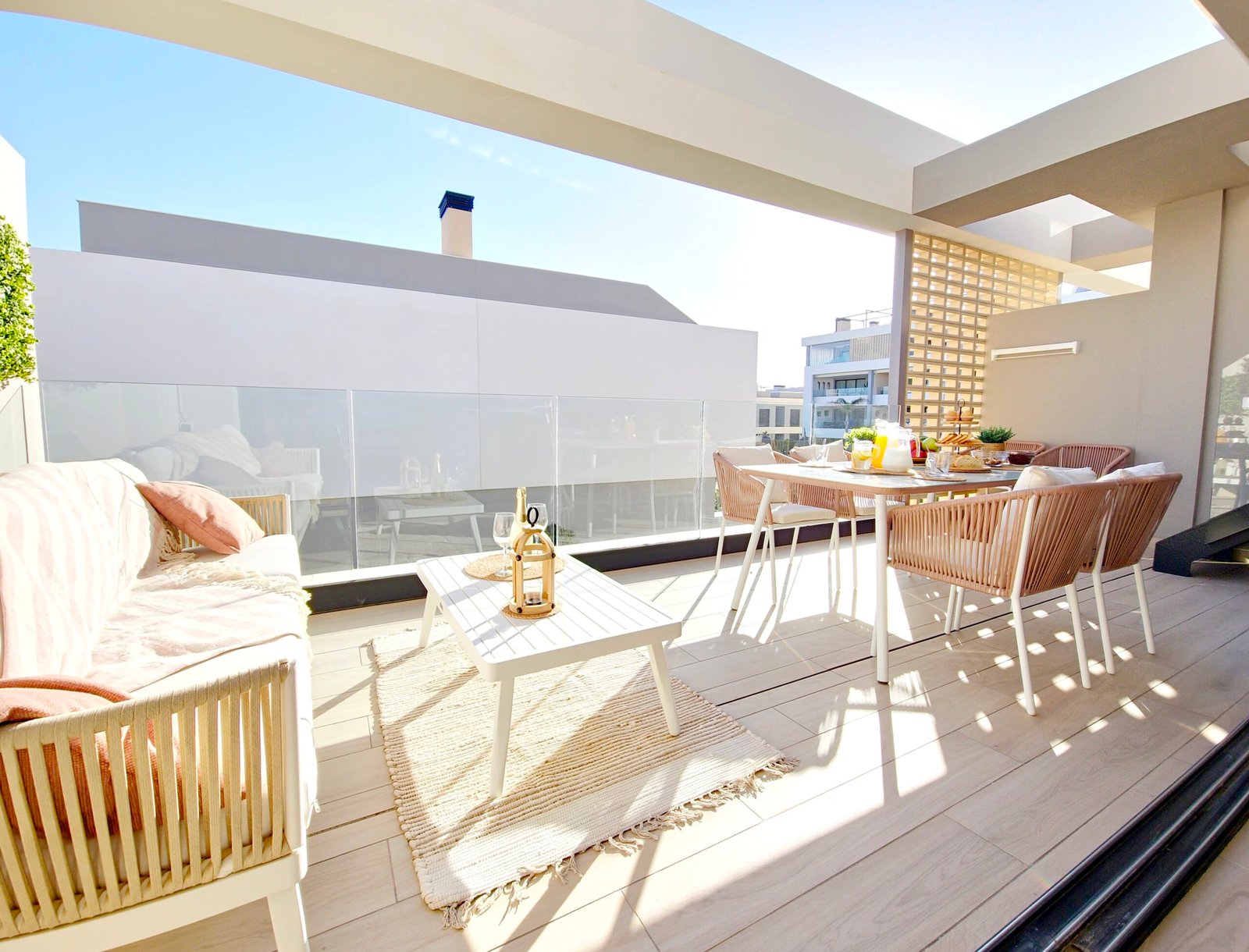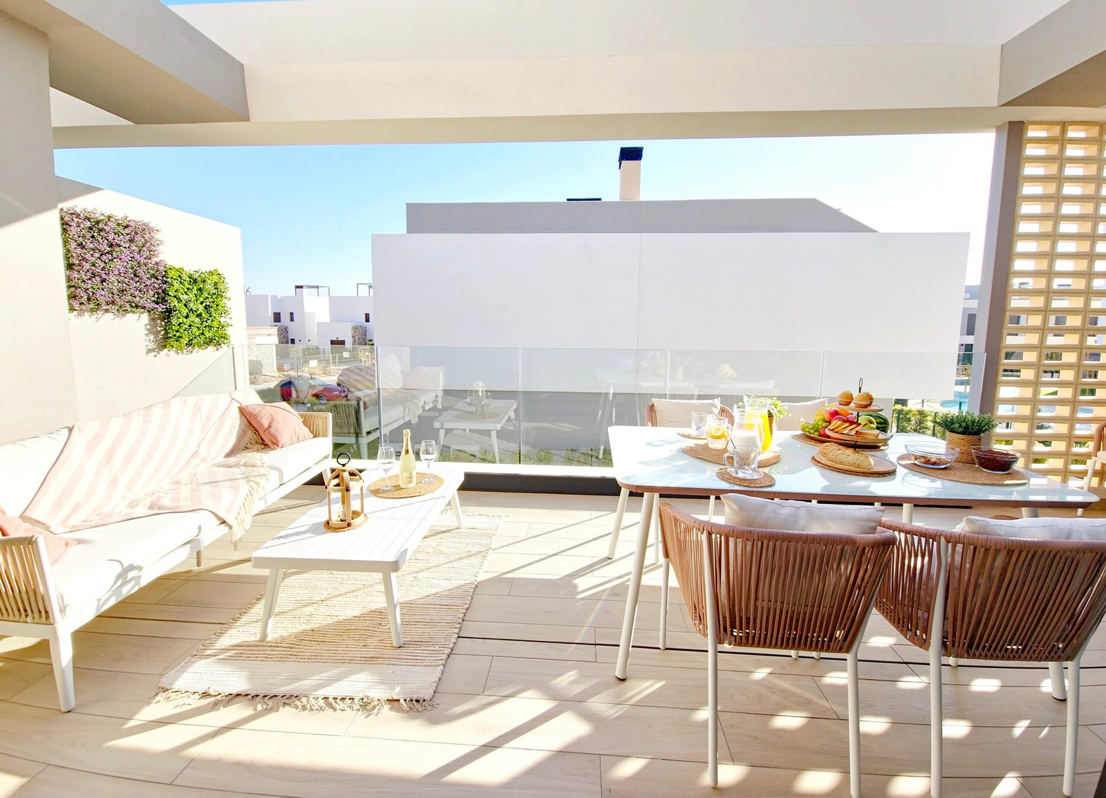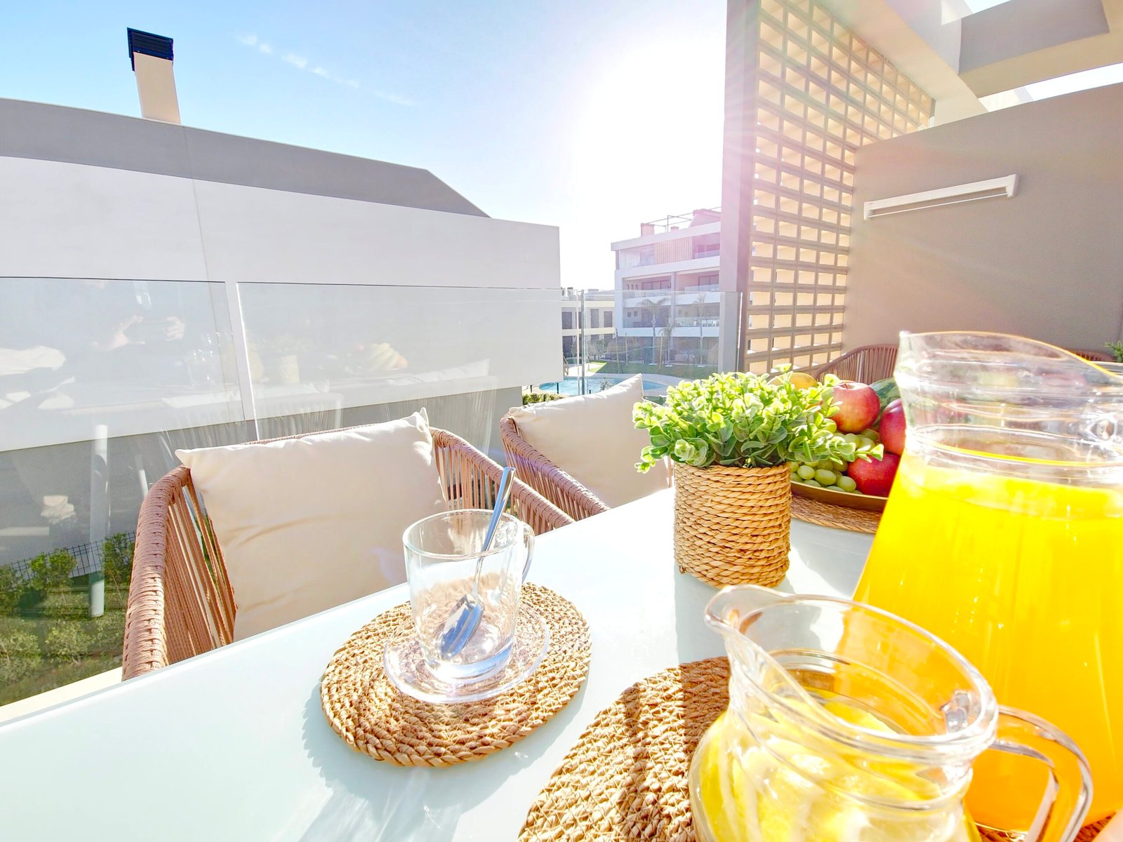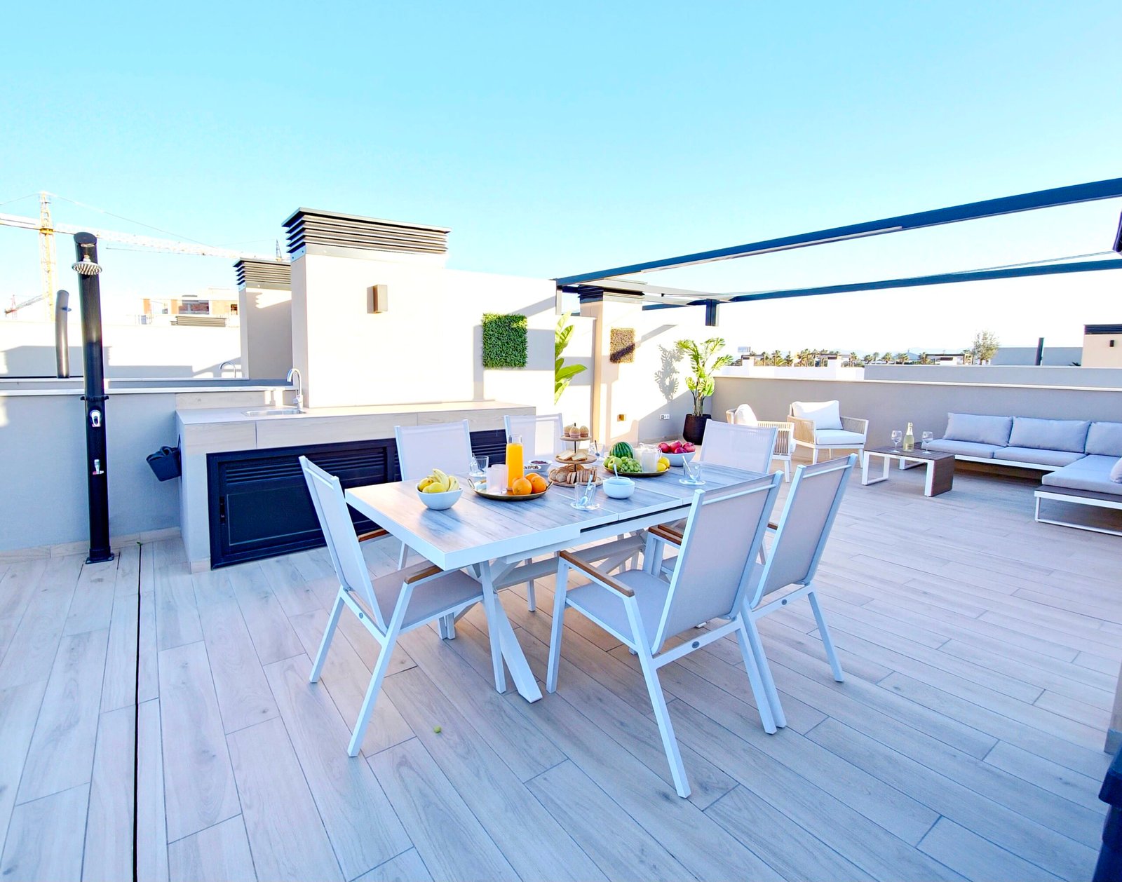 Huoneistoon kuuluu oma parveke sekä laaja yksityinen kattoterassi (solarium), josta avautuvat kauniit näkymät viheralueille ja resortin uima-altaalle – täydellinen paikka auringosta nauttimiseen ja rentoutumiseen.