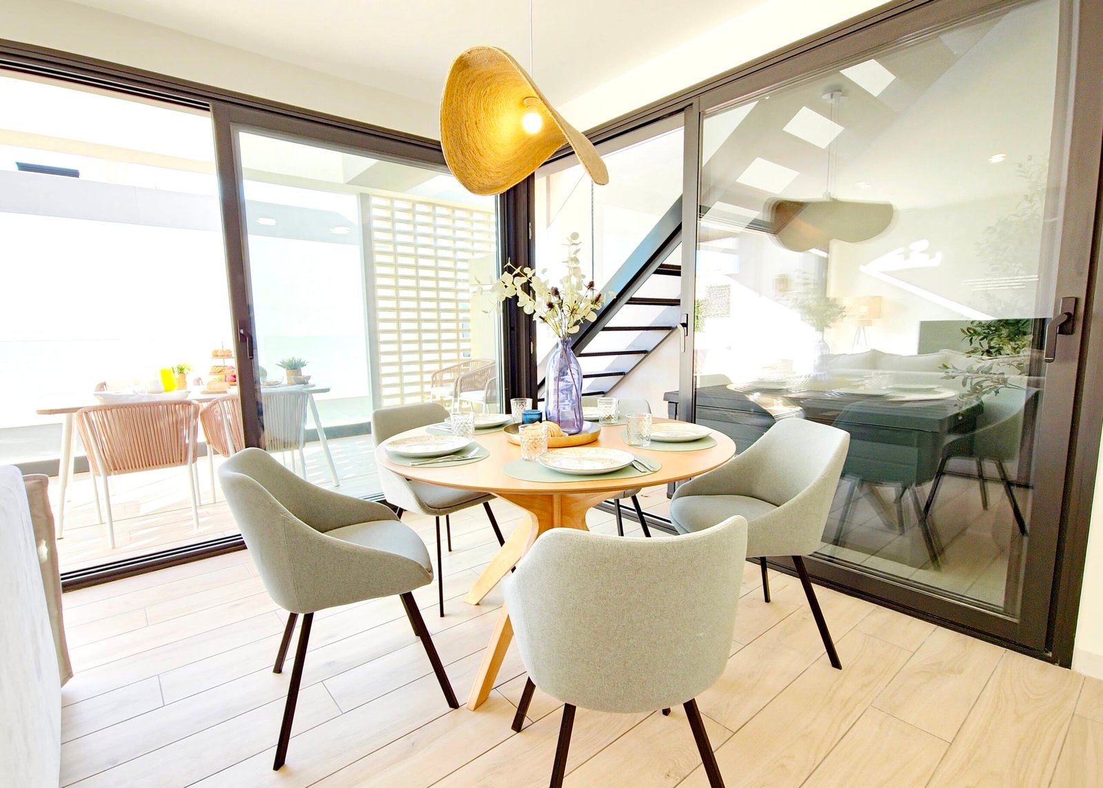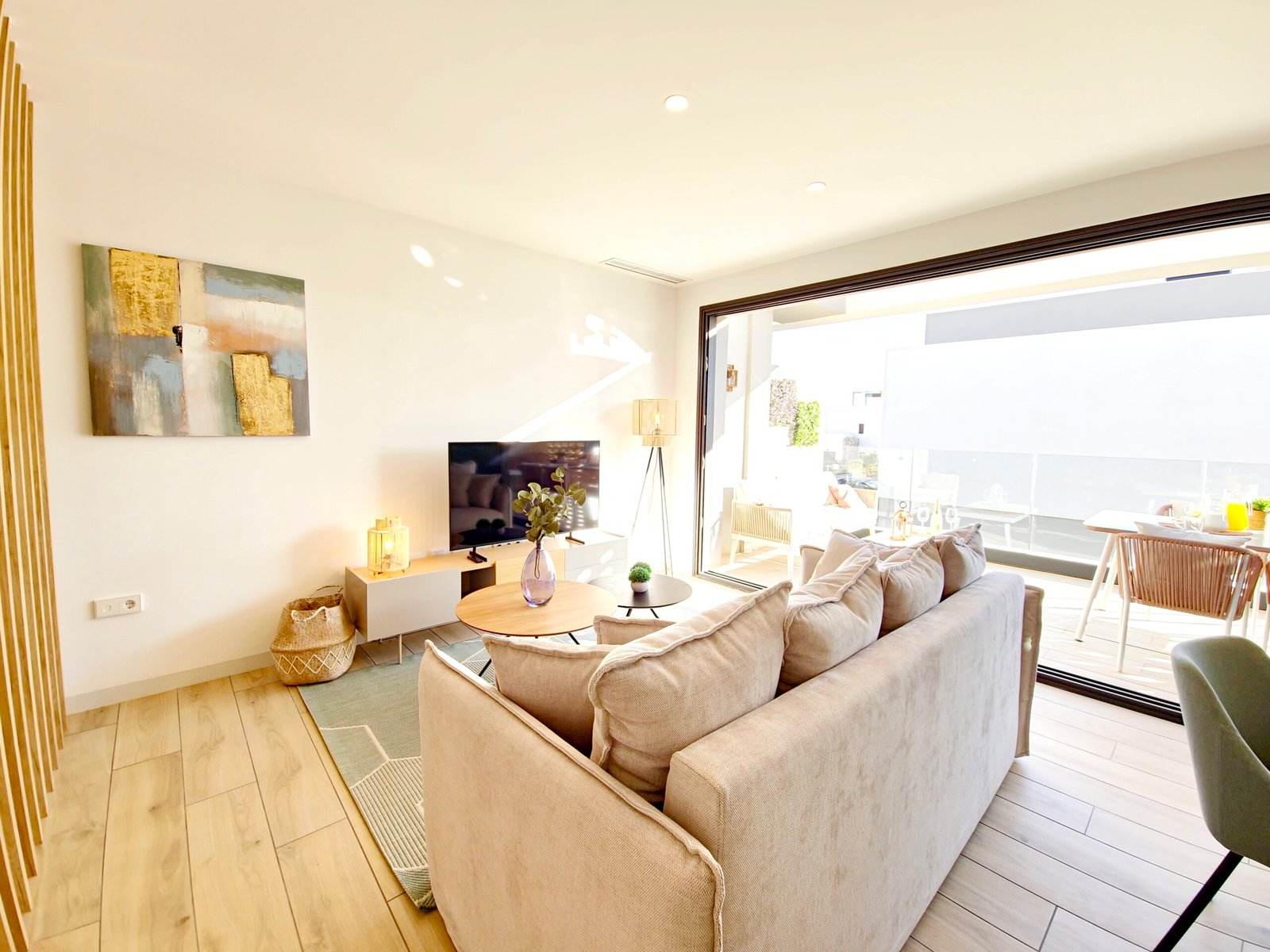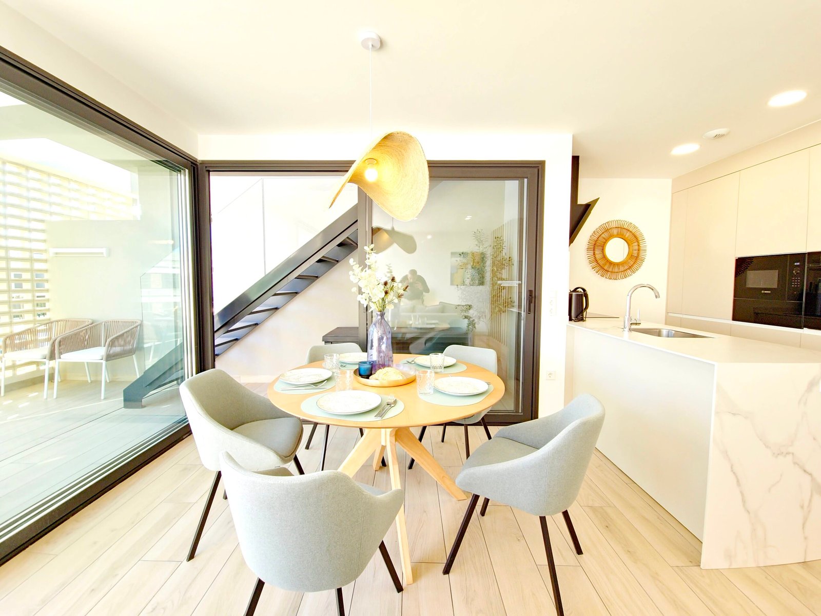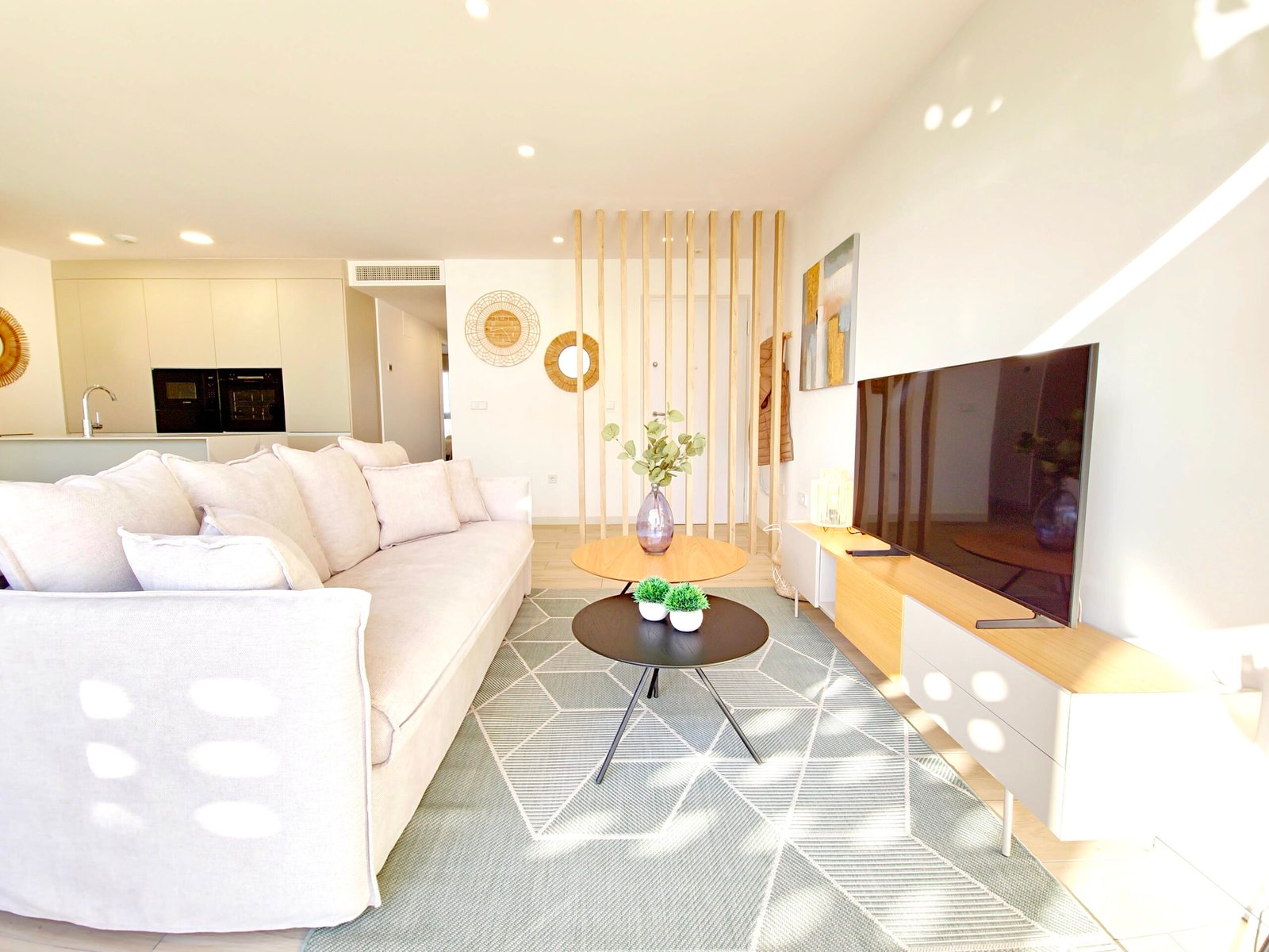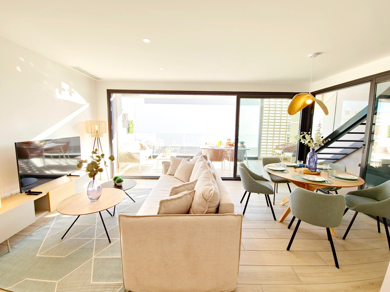 Avoin olohuone ja keittiö: Valoisa ja toimiva tila, joka yhdistyy saumattomasti ulkotiloihin.